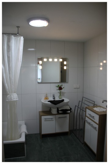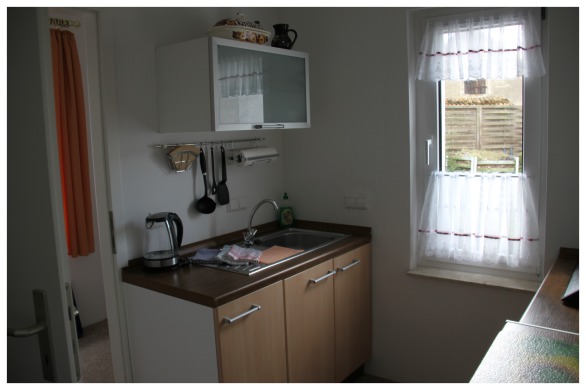 Unsere modern eingerichtete Ferienwohnung hat einen eigenen Eingang mit einer Küche und einem Wohn- Schlafraum sowie einem Bad mit Dusche / WC und Waschbecken und Waschmaschine. Der Wohn- Schlafraum